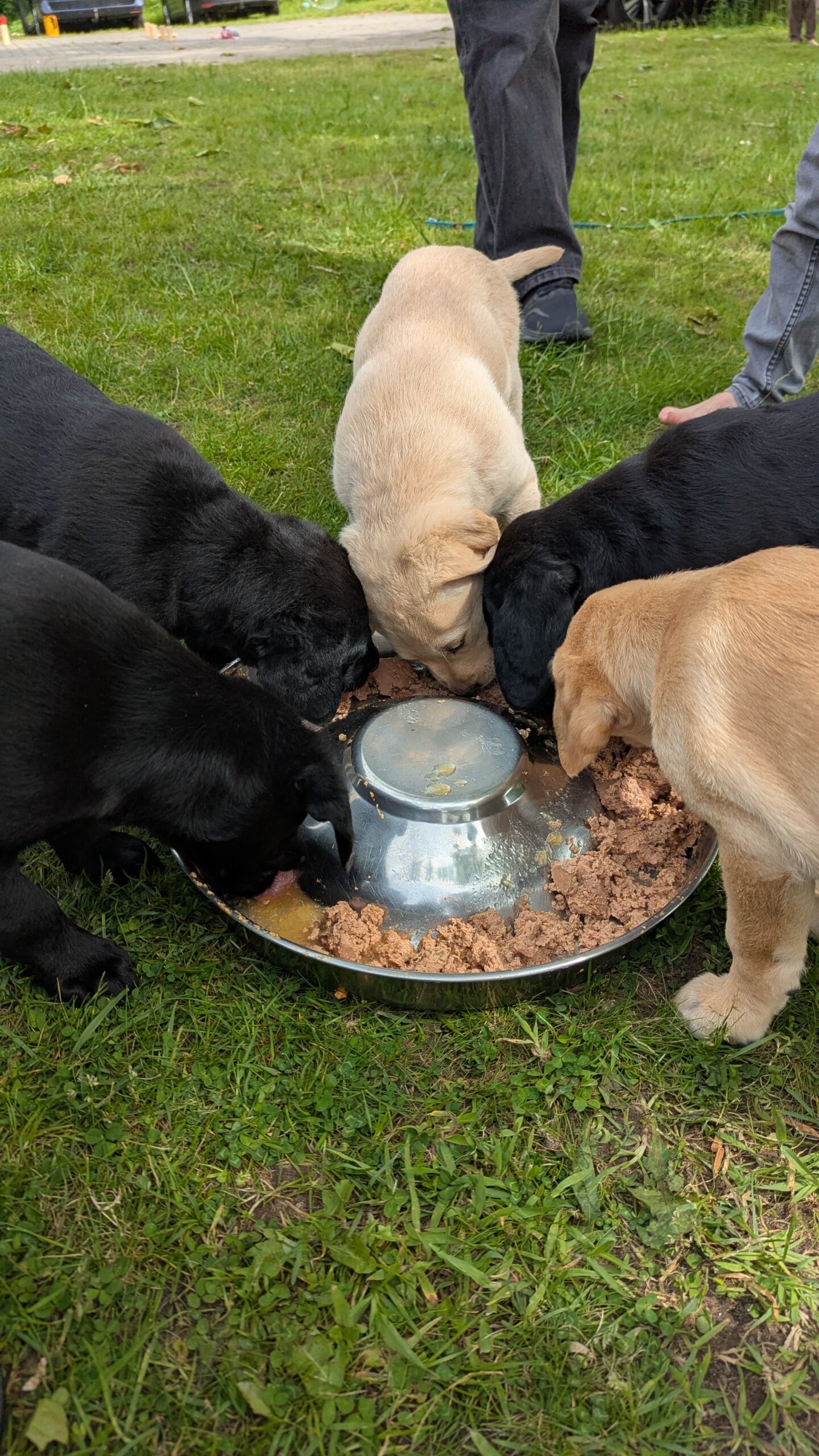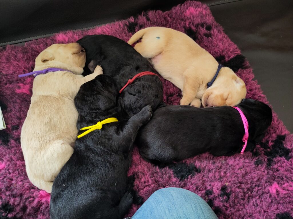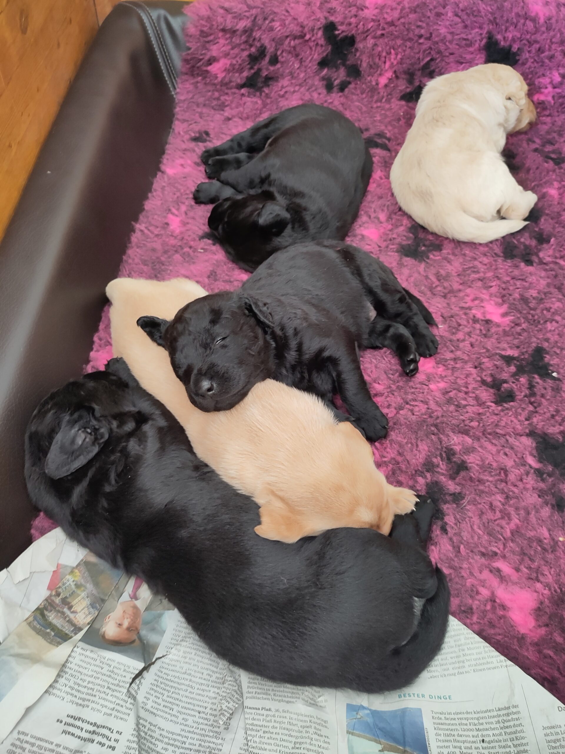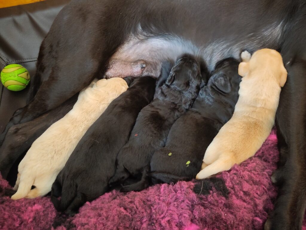 2 Rüden (1 gelb und 1 schwarz) und 3 Hündinnen (1 gelb und 2 schwarz)